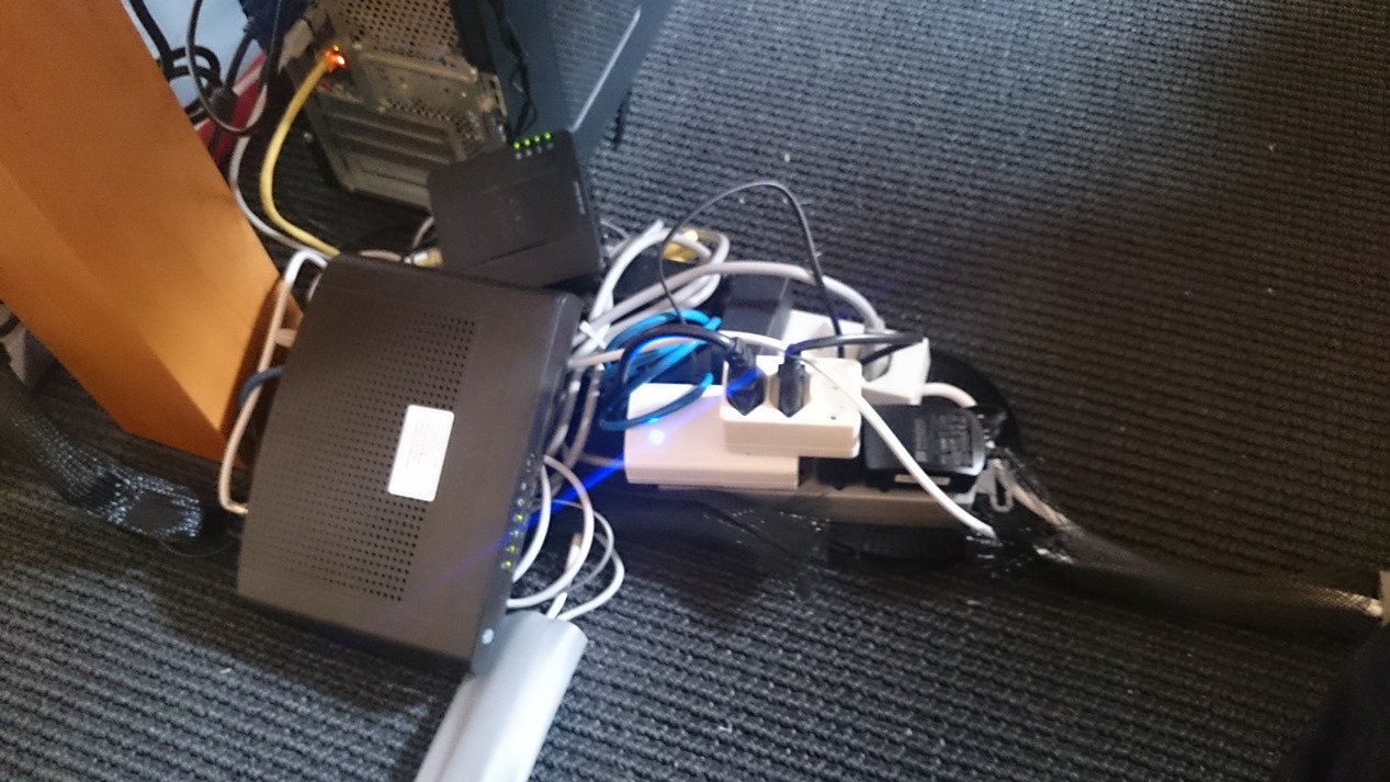 Modem, Router und diverse Netzgeräte unter dem Arbeitstisch, direkt im Fussbereich.